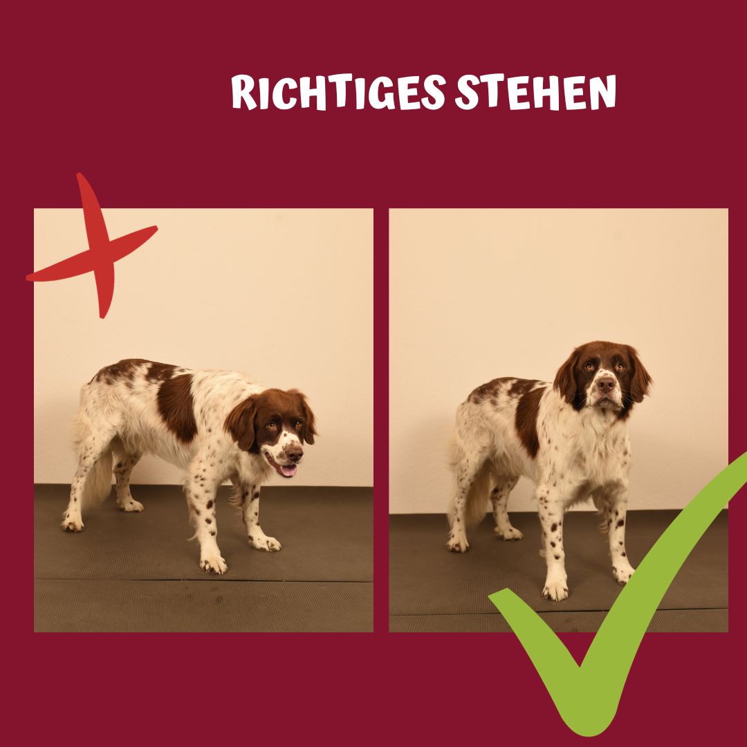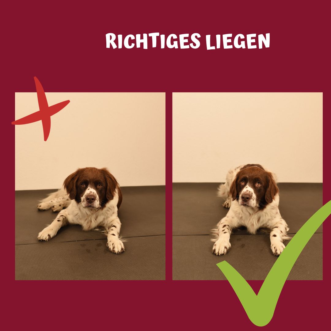 - liegt dein Hund, wenn du ihm das Kommando gibst gerade also Hinterpfoten unter dem Po und