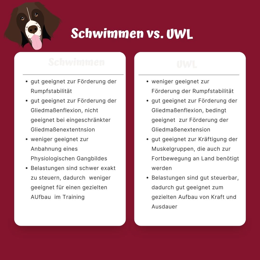 Der Vorteil des UWL ist, dass ein normales Gangbild und bestimmte Bewegungsmuster trainiert werden. Durch die genaue Steuerung und Beeinflussung von Trainingszeit, Geschwindigkeit, Wassertiefe und Wassertemperatur kann ein individuelles Training für den erkrankten oder Sportlichen Hund zusammengestellt werden.