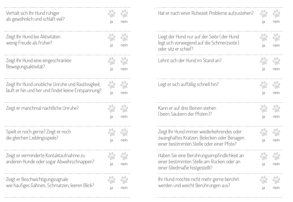 Erkennen können Sie Schmerzen beim Hund, wenn die oben genannten Merkmale nicht mehr zutreffen, also wenn er Verhaltensänderungen, körperliche Veränderungen zeigt oder Veränderungen am Gangbild und in der Körperhaltung aufweist, manchmal auch Lautäußerungen von sich gibt.