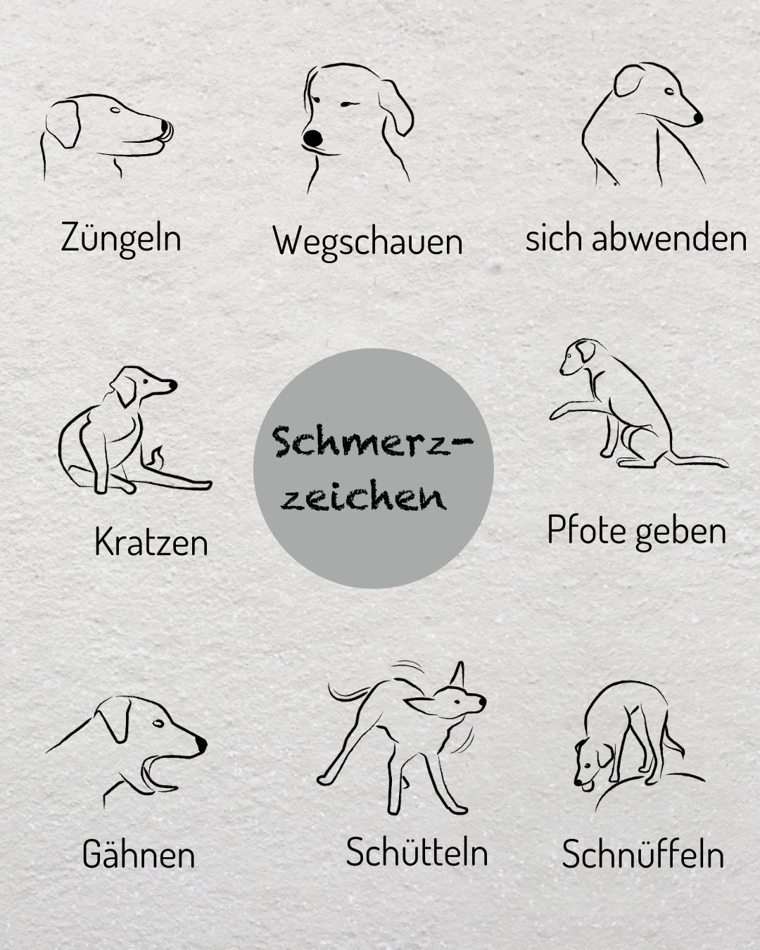 Jeder Hund ist individuell, somit auch seine Schmerzzeichen. Hunde zeigen Schmerzen oft ganz anders als wir Menschen. Manche ziehen sich zurück, andere werden plötzlich unruhig oder anhänglich. Typische Anzeichen sind: