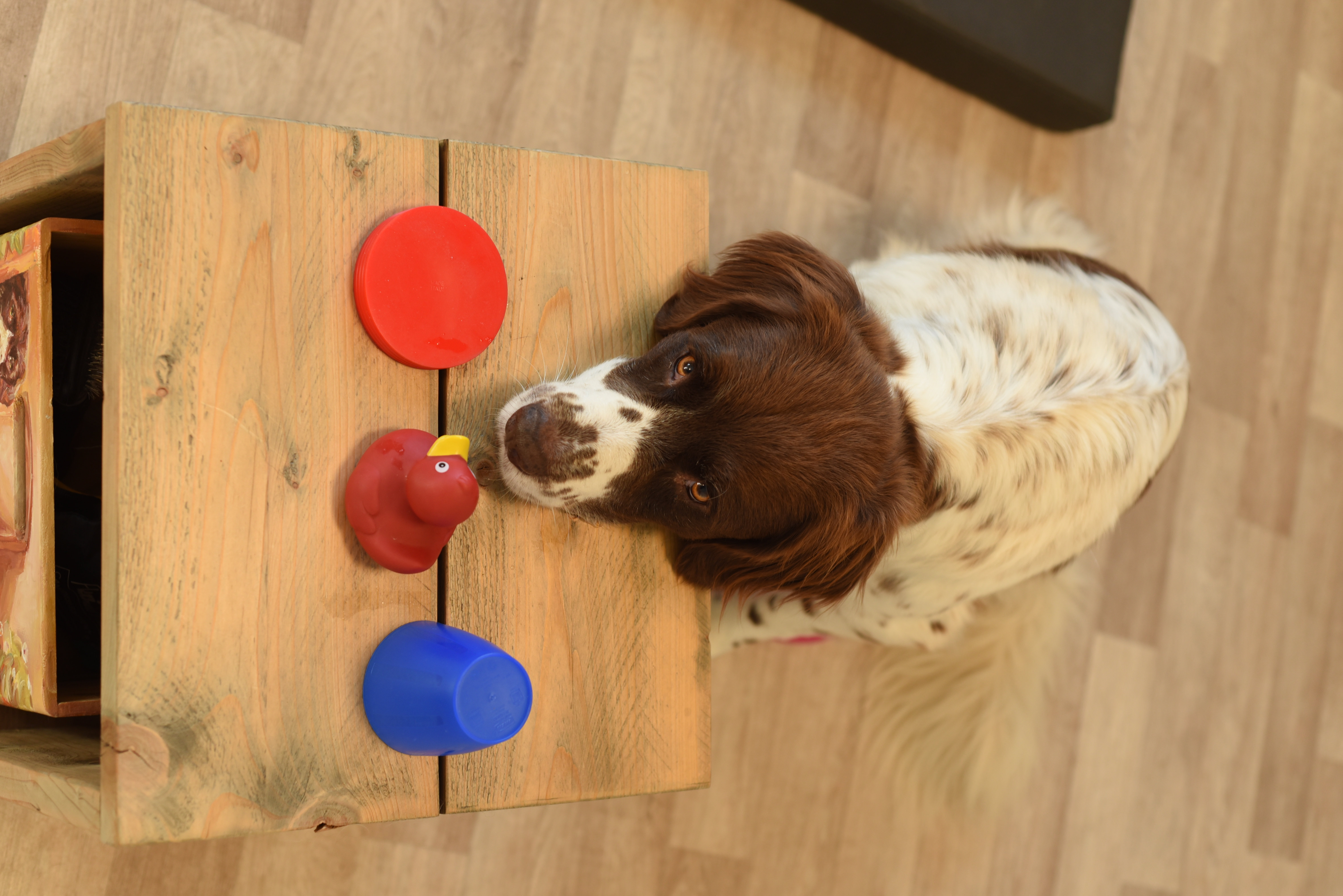 Eine schöne spielerei wo der Hund sich kaum bewegen muss, sondern nur sitzen können muss und dabei denken muss ist das Gegenstände unterscheiden. Dien Hund sollten schon das Anzeigen von Gegenständen (Stups) beherrschen