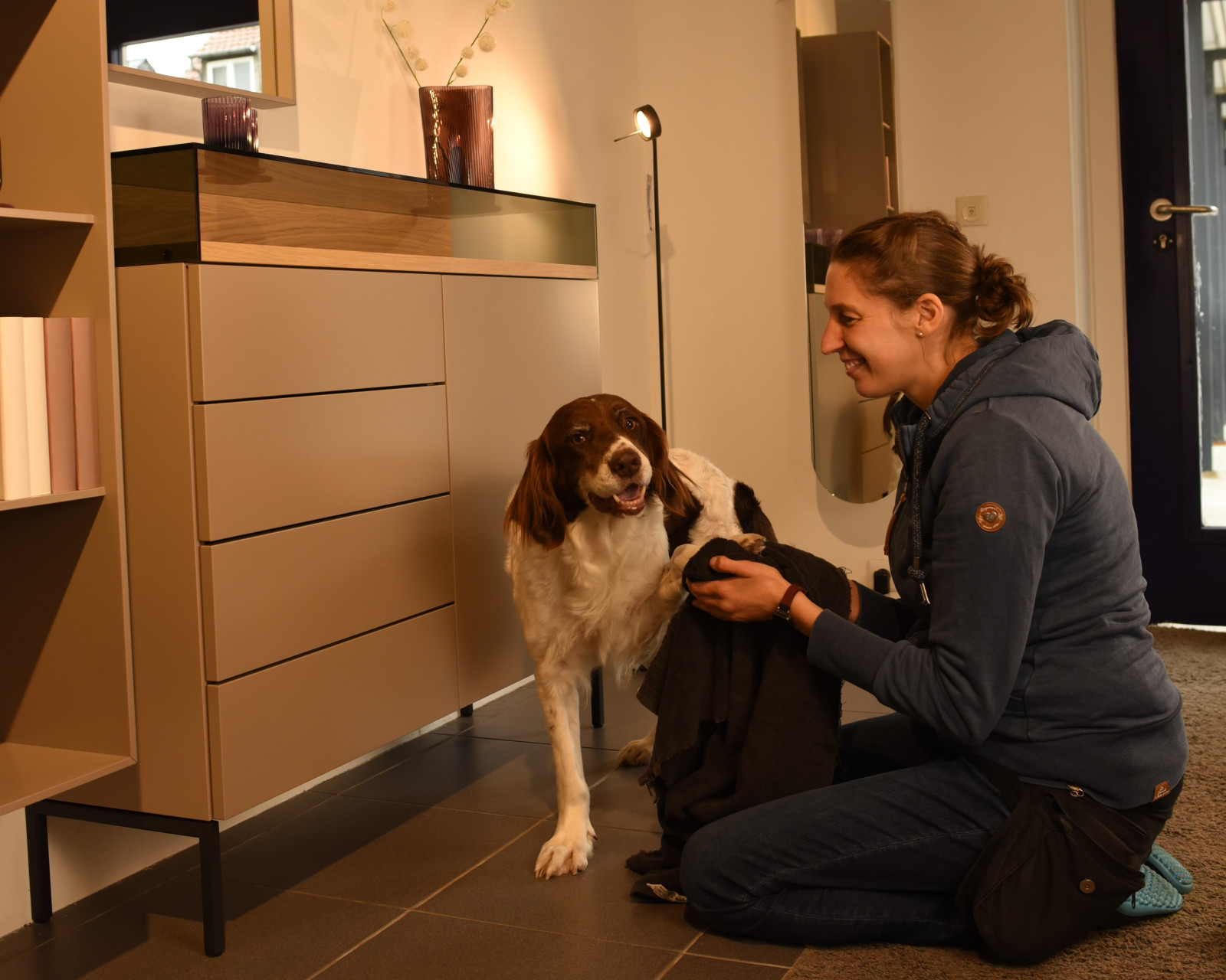 Nach jedem Spaziergang säubere und trockne ich die Pfoten meiner Hunde.