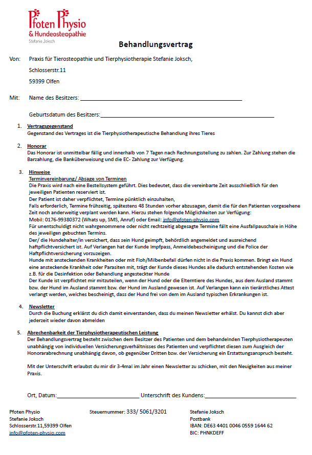 Mobil: 0176-99380372 (WhatsApp, SMS, Anruf) oder Email: info@pfoten-physio.com